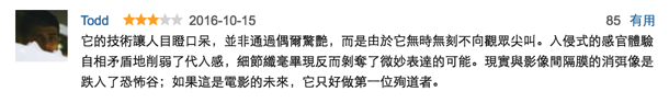 “有种身临其境的感觉,这是一场前所未有的观影体验,我简直激动地颤抖了。整部电影里我感觉我就在男主的旁边,看着这一切的发生,感受他的喜怒哀乐。”