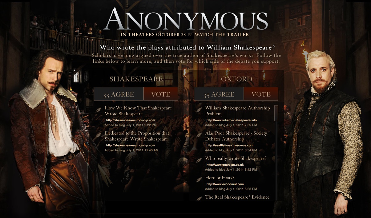 其实学术界一直有个说法,说是莎士比亚的剧作有可能并非莎士比亚所写,而是代笔!当然那个年代没有方舟子更没有微博,捕风捉影的事儿难以造成舆论影响。不过后人好事儿,想想要莎士比亚真是代笔,那得是个怎么样的故事——于是2011年的《匿名者》就孕育而生了。