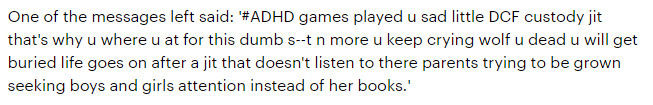 ‘你是有多动症吧,真是蠢得要命。你可以一直喊‘狼来了’,然后去死,然后被人们埋了,因为你是个根本不听父母话的惹事精,总做些夺人眼球的事,根本不把精力用在读书上。’