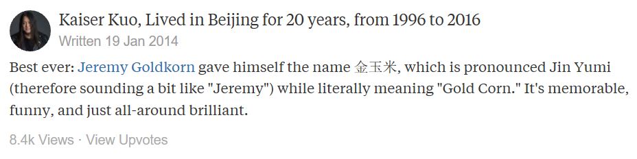 Jeremy Goldkorn给自己起名叫“金玉米”,我觉得这名字厉害了,既是名字Jeremy的音译,又是后面Goldkorn的意译。。。