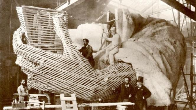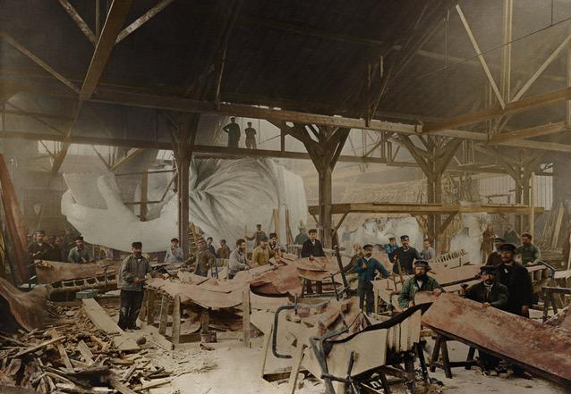 1882年,工人们正在搭建铸造自由女神拿着《美国独立宣言》的左手。