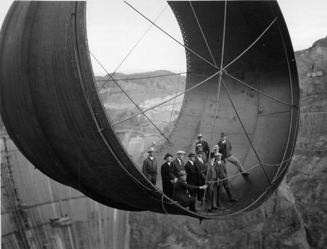 这张照片是在1935年胡佛水坝即将完工的时候,工程师们站在一个巨大的压力引水管道里向外眺望是拍摄的,极其珍贵。
