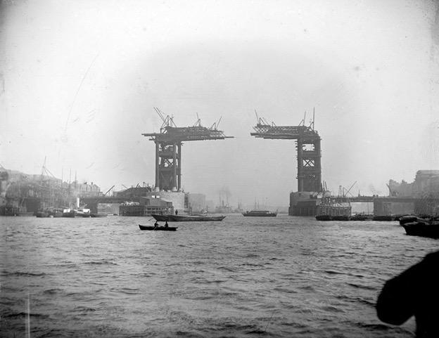 1889年,才搭好简陋支架,双塔都未连接上的伦敦塔桥。