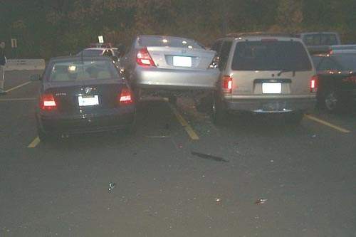 把旁边两辆车都撞坏了,车也没倒出来。。。