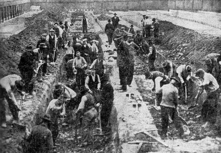 这里也出现了棺材不够的情况,只能挖坑群葬…
