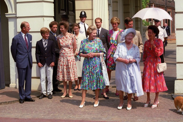 1990年,皇室的亲戚们在给女王的母亲庆祝90岁生日