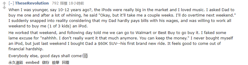 我忽然明白过来,爸爸的工资支付家里的账单都够呛,却愿意…加班为我买iPod(我们家3个孩子)。