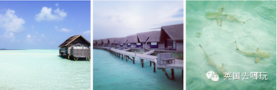 全是水上小别墅,住在里面可以直接看见水中的鱼,蓝天碧海海上美景,赞!