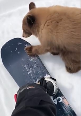 最后,得寸进尺的熊宝宝干脆爬到滑雪板上,想知道这群人类站在这块破板子上究竟是在干嘛。