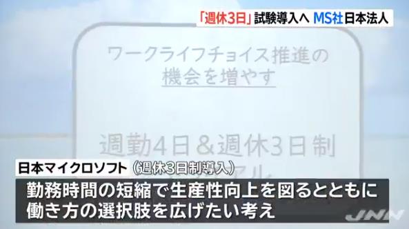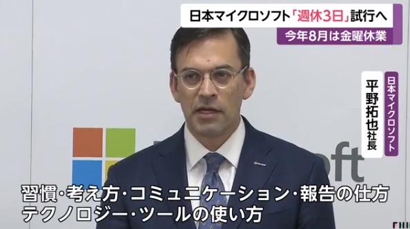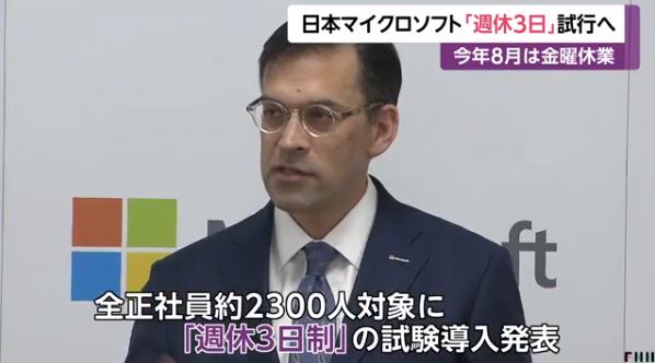微软日本于4月22日宣布一项工作改革试验新举措,公司将于今年8月和明年8月尝试一周三休的制度,涉及对象是全公司约2300名正式员工。