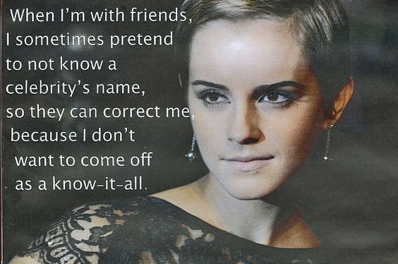 “当我和朋友们在一起的时候,有时候我会假装不知道或记错明星的名字,这样朋友就可以纠正告诉我。因为我不想表现的像个讨人厌的万事通。”