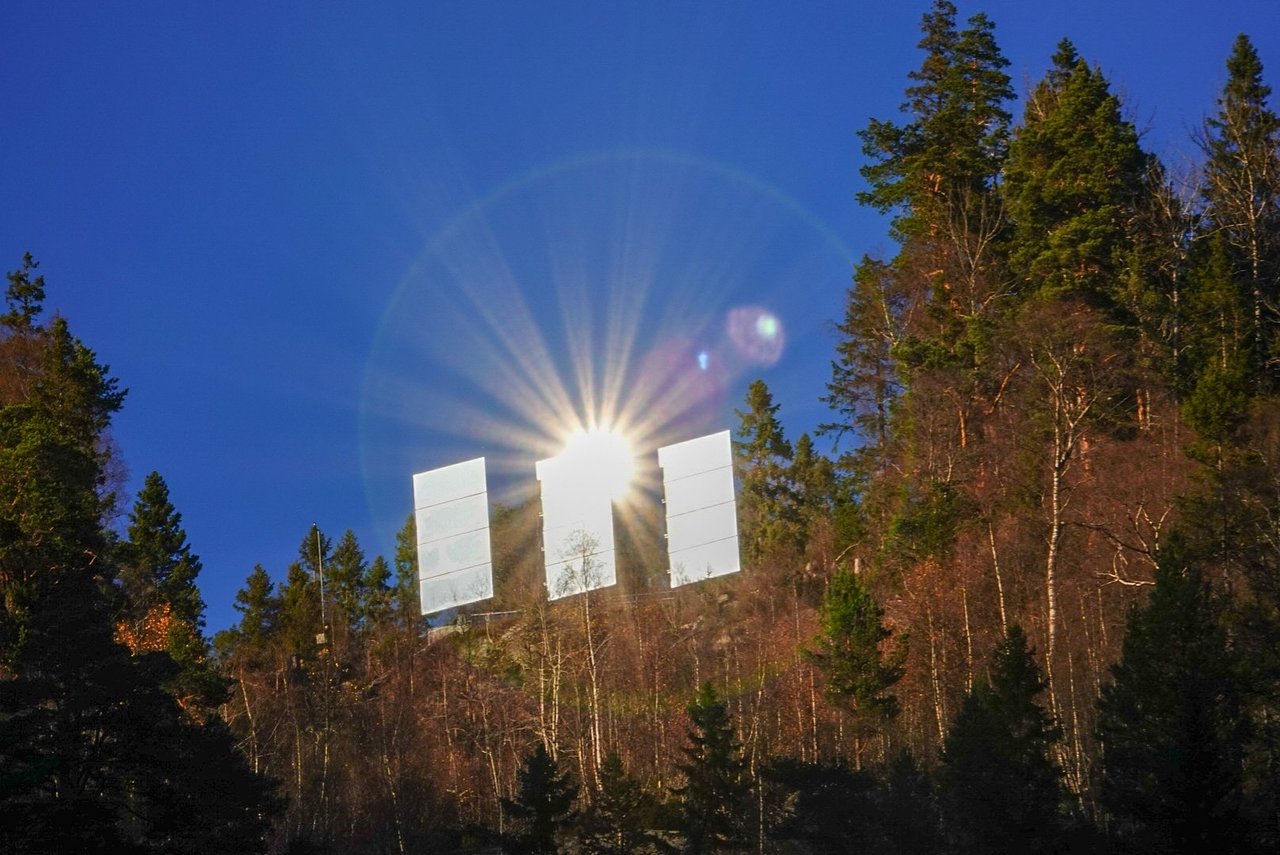 这三个由计算机驱动的镜子会跟随太阳的运动自动调整方向,捕捉太阳光线并将它们反射到Rjukan的城市广场之中,