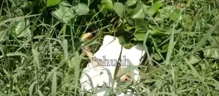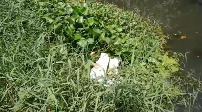 视频一开始,小河里的水草丛中,漂着一块白色的泡沫塑料,