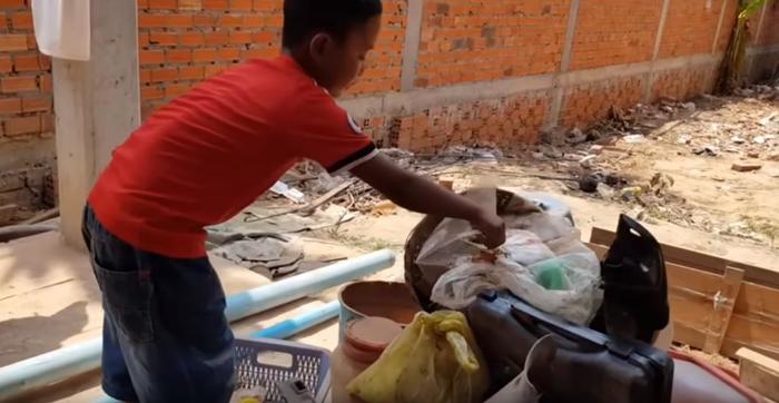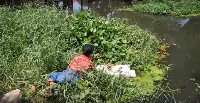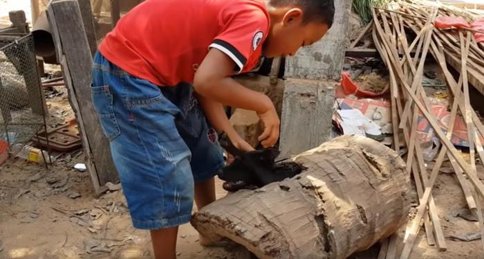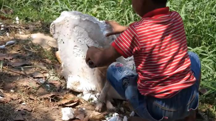 男孩试了好多办法都行不通,最后才想起来把泡沫掰成两半,把狗子救了出来。