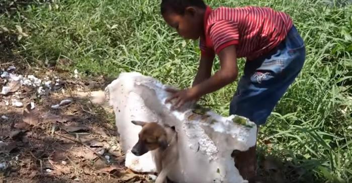 狗子的头、脖子和两条前腿被卡在泡沫塑料里,男孩尝试了各种办法,终于将狗子救了出来。