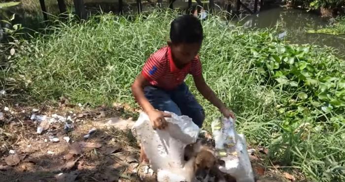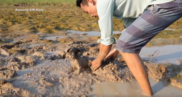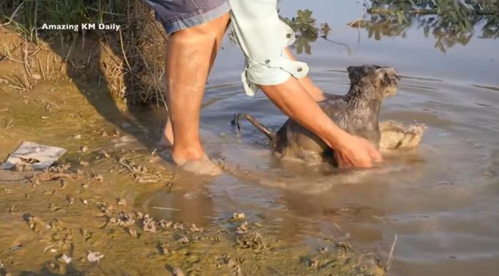 所谓的“救援”就是男孩将狗子身上的绳子解下来,把狗子抱到旁边的小河里洗掉身上的泥,