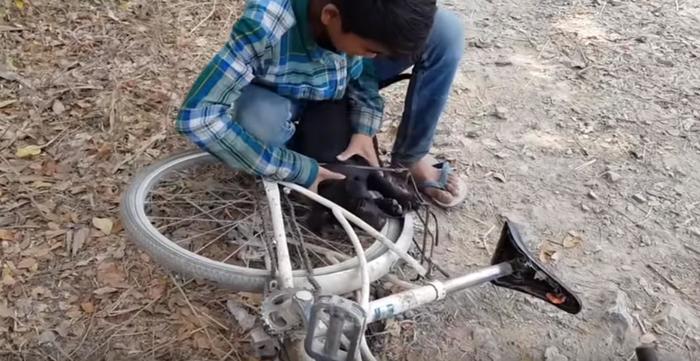 比如这段视频中,一只黑色的小狗被卡在自行车里,一名男孩试图把它救出来,