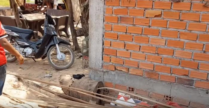 就看到墙角有一只小狗被困在一节木桩里,只有头露在外面,