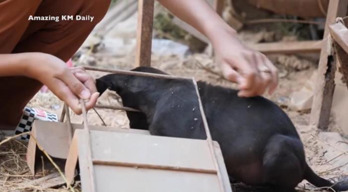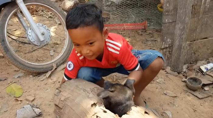男孩又是拉又是拽,狗子看起来非常难受,最后终于被“救”出来。