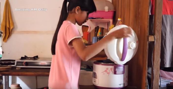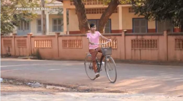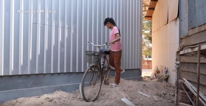 镜头一转,女孩吃力地推着自行车穿过一个窄窄的入口,来到一个土堆上,慢吞吞地把车停稳,
