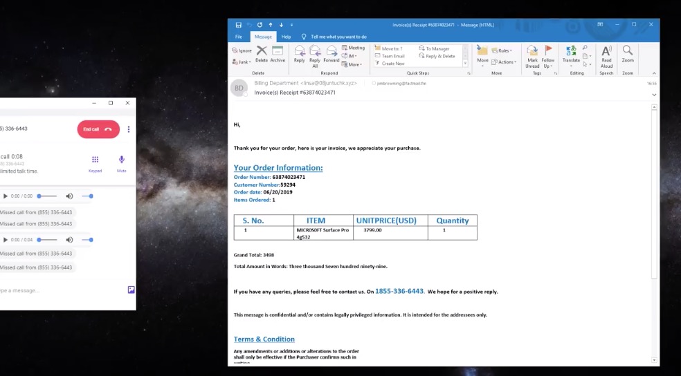 Browning很清楚,自己最近没有在任何购物网站上下这么一个订单,更奇怪的是,这封邮件没有公司名称,没有链接,只有一个联系电话….