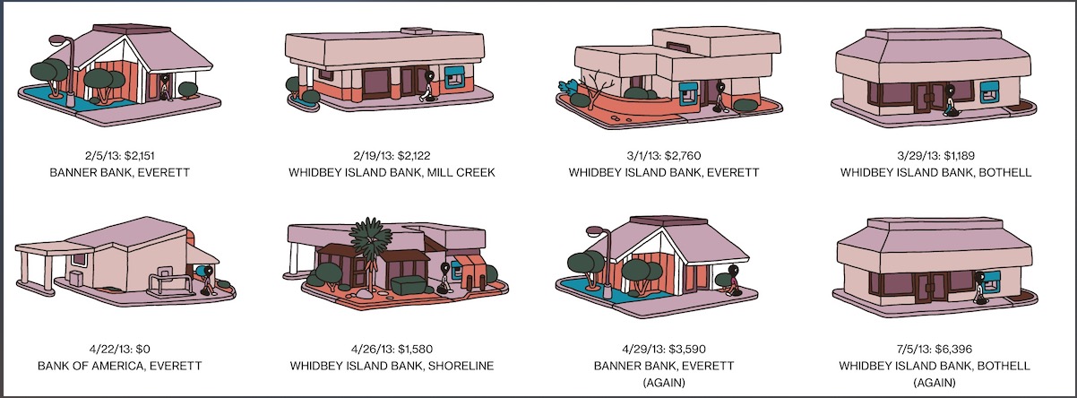 有几个银行因为交通便利(方便逃跑),现金流多,成了Hathaway多次回头光顾的地方: