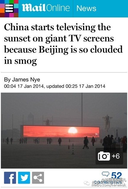 好吧,北京播放模拟日落的大屏幕。。。果断又被英国媒体从微博上看到以后爆料到全世界了。。。。