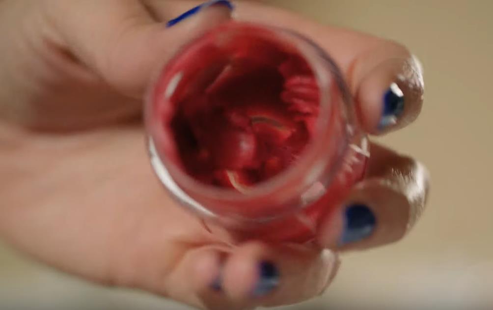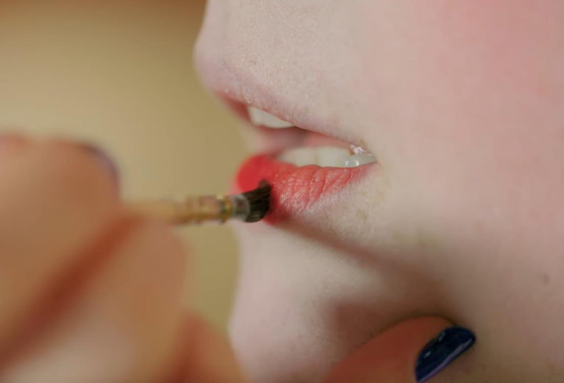 腮红结束后是口红,用的是混合了蜂蜜与红色化妆品原料的手作口红。