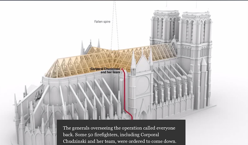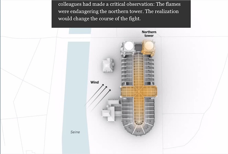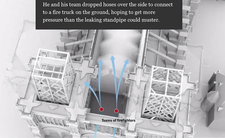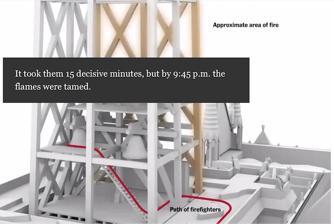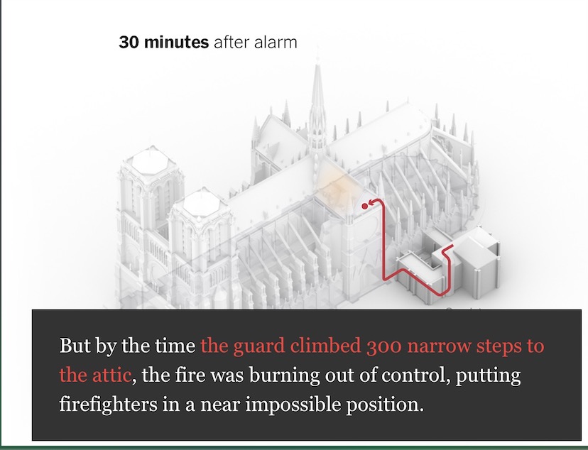 消防队员们抵达现场时的现场状况是极其危险的,因为前面犯下的一连串错误,队员们冲进教堂大厅,爬了300级台阶冲上着火点——教堂主厅上方的木阁楼时,发现火势已经到了消防队员也无能为力的地步,他们根本没法再靠近木阁楼一步了,无奈之下,他们只得被迫撤退….