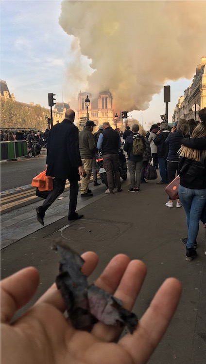 7点29分,此时,已经有烧焦的木质灰烬飘到游客手中….