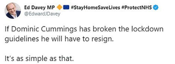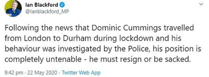 “正在关注Dominic Cummings在封锁期间从伦敦去达勒姆的新闻,他的行为曾被警方调查过,他将职位不保——他必须辞职或被解雇。”