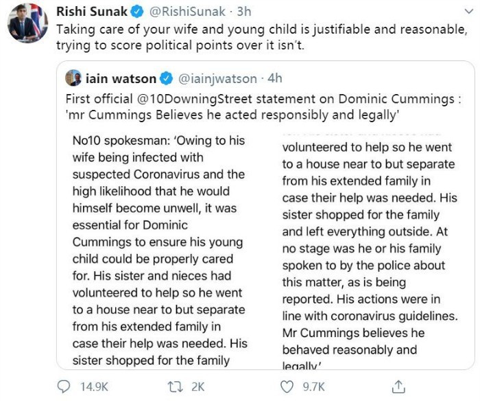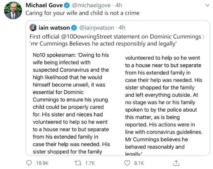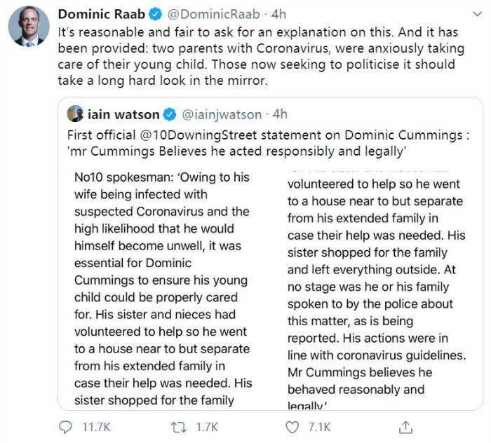 他觉得唐宁街的人应该知道Cummings私自出行的事,所以现在最关键的问题就变成了,首相Boris必须就“包庇Cummings”一事做出回应。