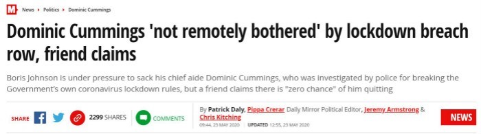 昨天,有媒体爆料Cummings在确诊感染新冠期间(是的,他后来自己也确诊了),不顾政府对感染者的隔离规定,私自出行,开车前往约270英里外的父母家,结果被邻居发现,Cummings也没有因为违法规定被罚款60英镑。