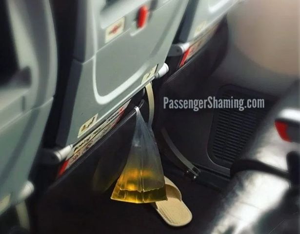 -某个乘客拍到的画面:邻座把装满小便的塑料袋绑在飞机座位后方,臭气熏天…↓
