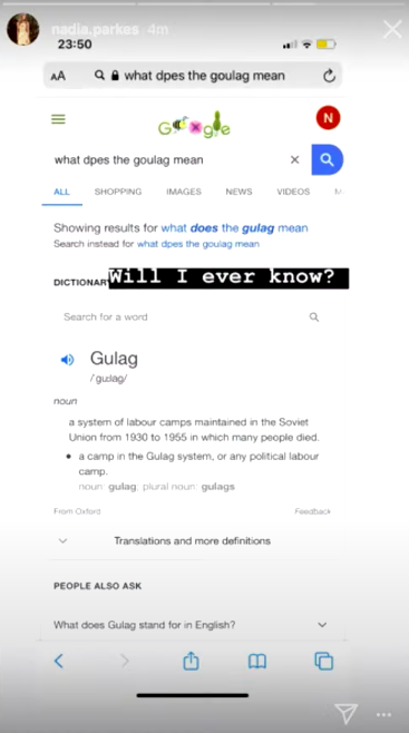 此外,纳迪亚曾特意发过一张截图,上面是她在谷歌上搜索“‘goulag’是什么意思”,