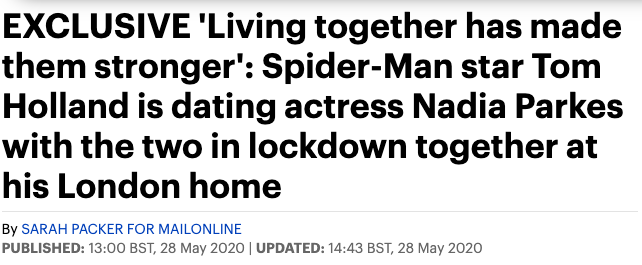 https://www.dailymail.co.uk/tvshowbiz/article-8362153/Spider-Man-star-Tom-Holland-dating-actress-Nadia-Parkes.html