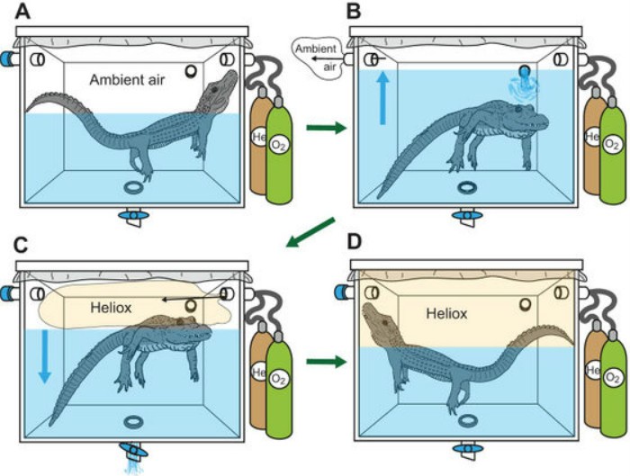 在实验中,几位研究员把一只扬子鳄放在密闭的池子中,在里面注入空气和氦气的混合气体,