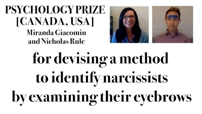 获此奖项的两位研究者发现,自恋的人,眉毛长得会更特别。