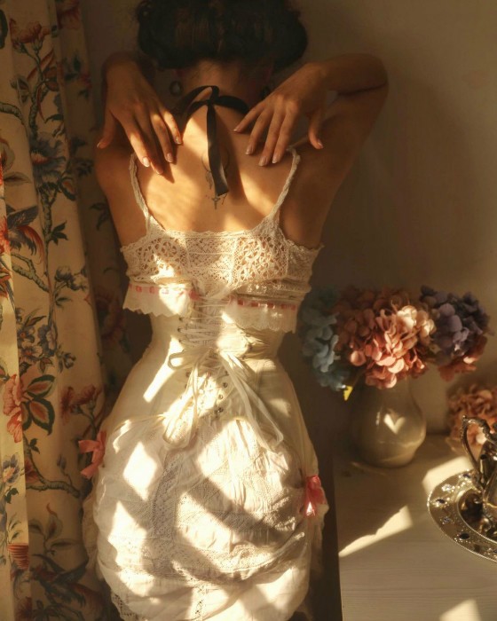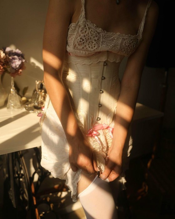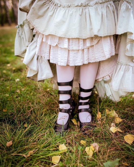 在内衣衬裙外,先穿一件紧身衣,一双吊带丝袜,和一双复刻维多利亚时代的鞋子;