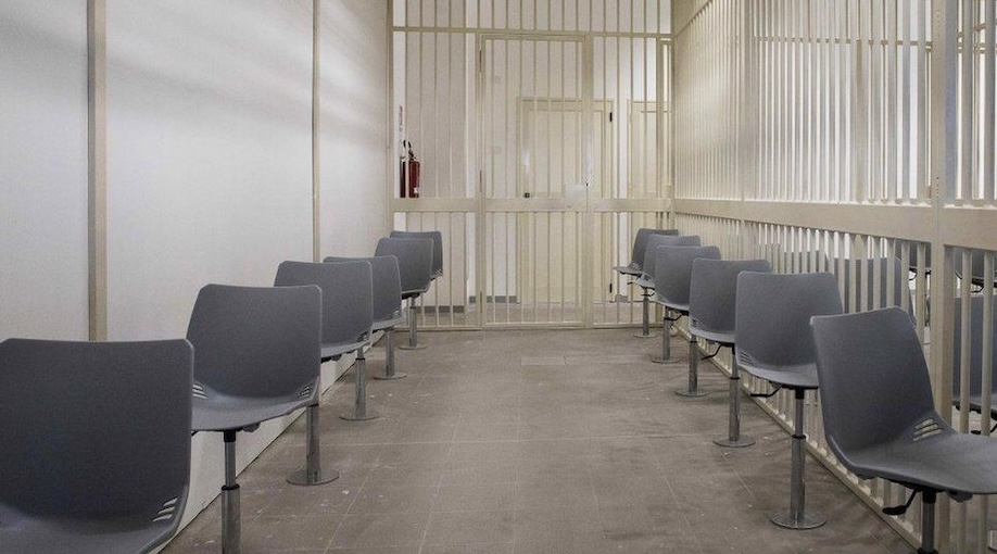 355名被告将会在大厅角落这个巨大的铁笼里听候发落。