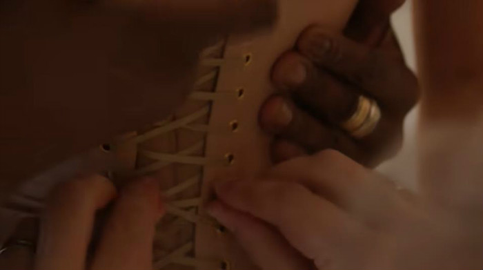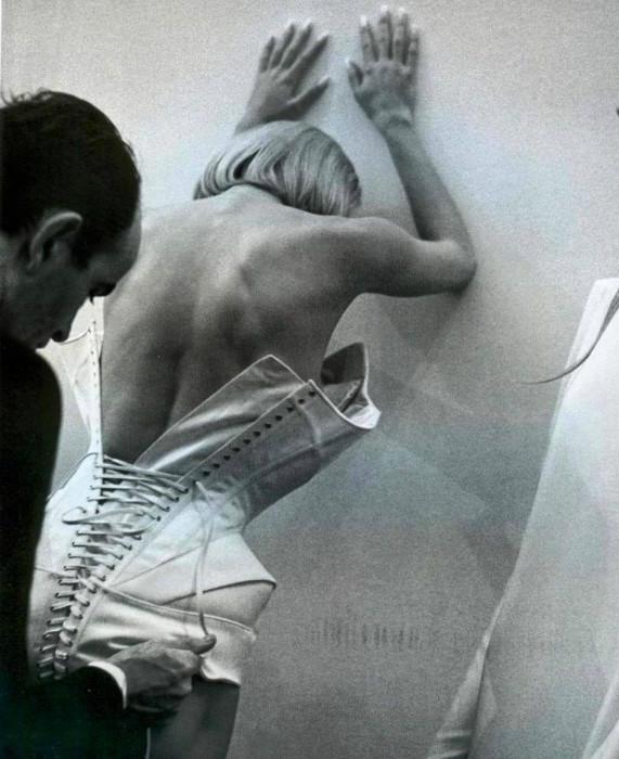 她是无法自己穿上紧身胸衣的,完全依靠三位工作人员帮忙,好像把她放到一个精心打造好的模子里,
