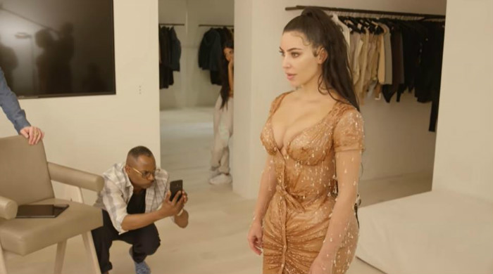 为了塞进这件紧身礼服Kim也是拼了,仍然是靠三位工作人员的努力才帮她穿上。