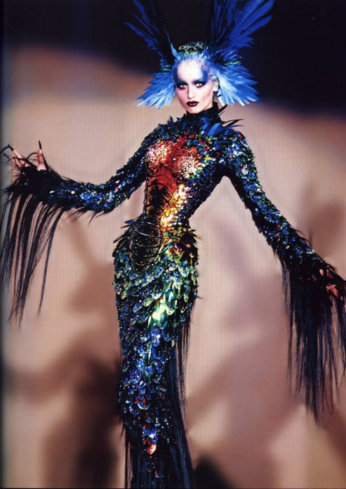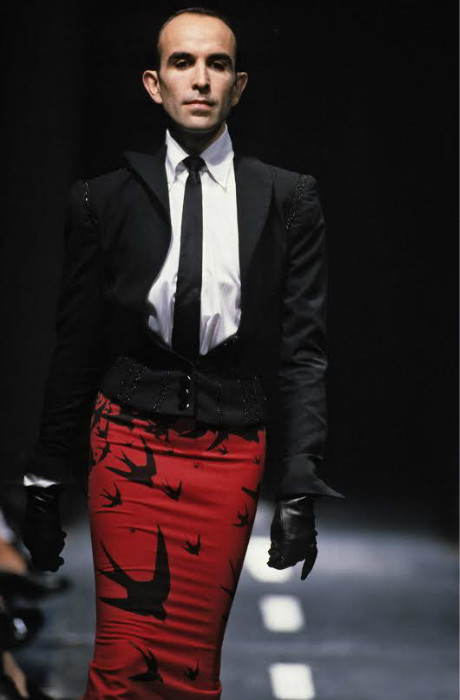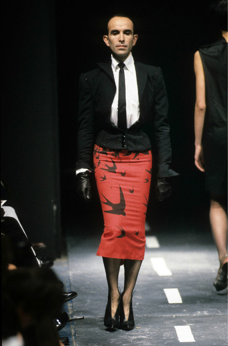 同年的Alexander McQueen时装秀上他还亲自当了一回模特,穿的正是他自己设计的紧身胸衣,这也是他唯一一次走T台。