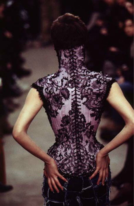 1996年秋冬Alexander McQueen时装秀上,珍珠先生设计的一件紧身胸衣一鸣惊人,