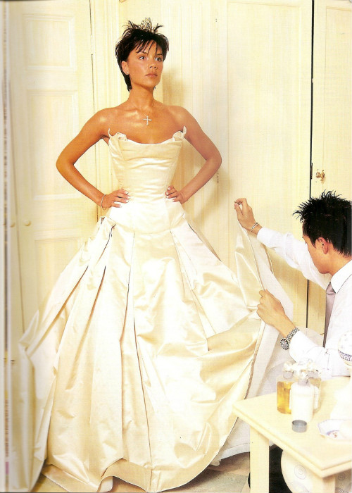 比如1999年,贝嫂Victoria Beckham身穿Vera Wang婚纱走进婚礼殿堂,为了打造细腰效果,婚纱下穿了一件珍珠先生的紧身胸衣。
