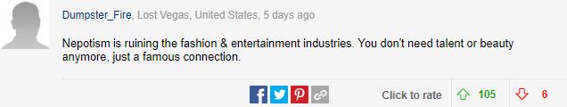 “裙带关系正在摧毁时尚业,你不再需要天分和美貌了,你只需要有个著名的亲戚。”