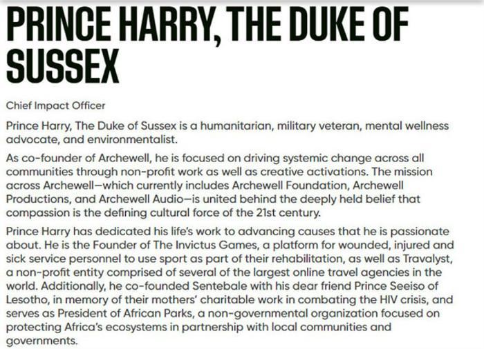 公司的声明中称他为“哈里王子,苏塞克斯公爵”,评价他是一位人道主义者、退伍军人、精神健康倡导者和环保主义者。