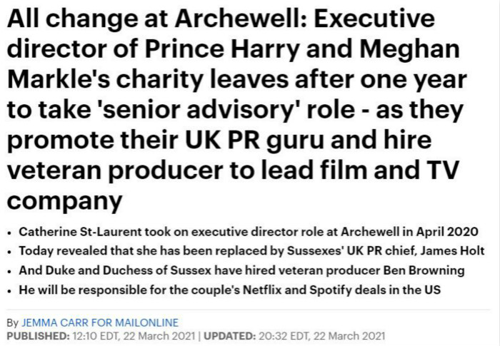 先是他们成立的非营利组织Archewell的执行董事Catherine St Laurent宣布离职,