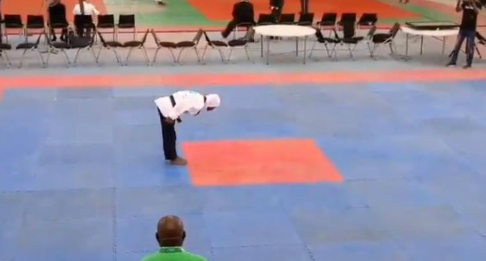 她参加的是跆拳道品势赛,与对打不同,这种比赛是非接触性的,