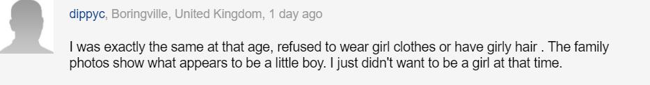 跟我那个年纪一样,拒绝穿女孩衣服,不梳女孩发型。家庭照片里我就像个小男孩。我只是在那时不想当女孩而已。